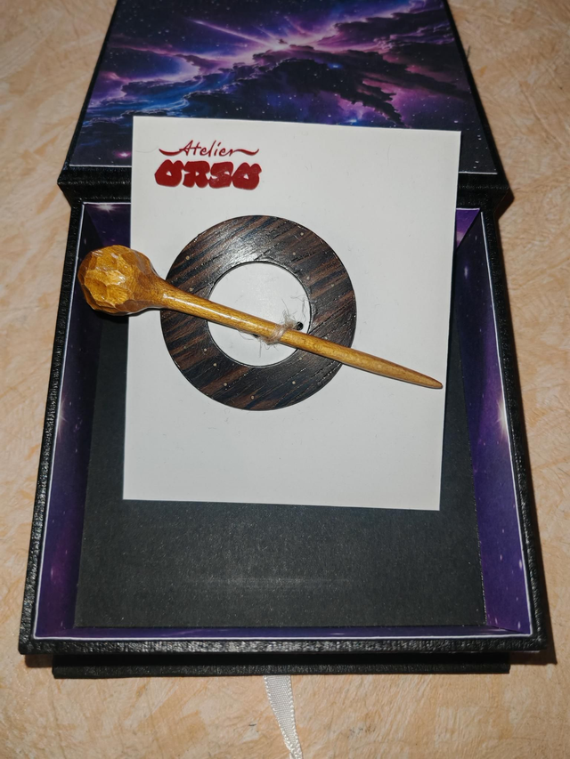 Elle est livrée avec sa boîte, elle aussi faite à la main.